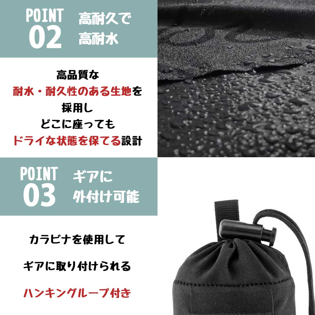 ●耐水コーティングを強化。濡れた草むらなど、座る場所を選びません。