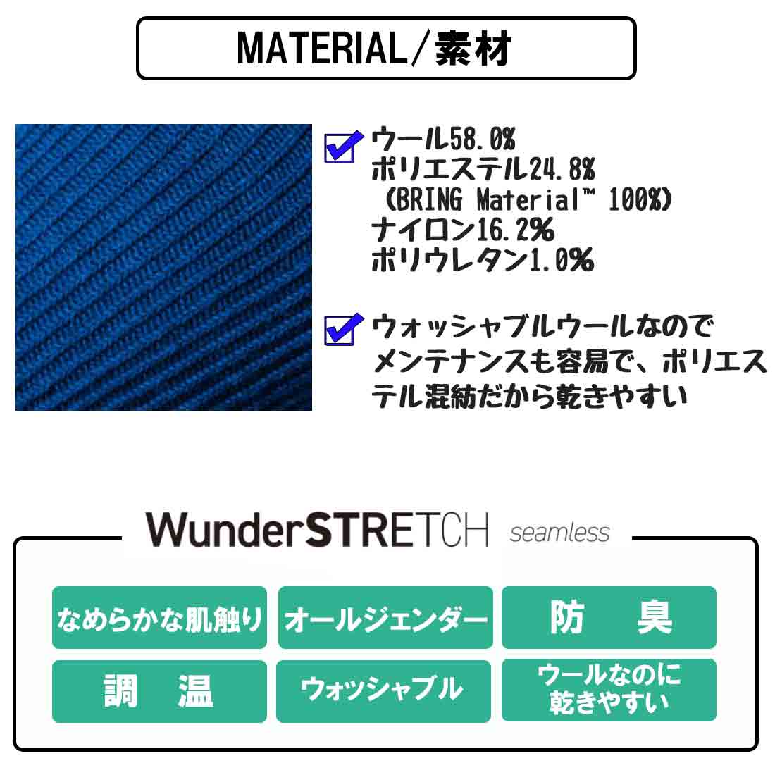 ■素材:ウール58.0% ポリエステル24.8%(BRING Material 100%) ナイロン16.2% ポリウレタン1.0%