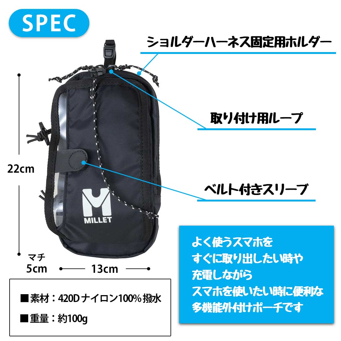 リュックサックのショルダーハーネスやウェストハーネス等に取り付けて便利な収納を追加できる多機能ポーチ。裏側ビニール仕様のフロントポケットには大きめのモバイル端末が収納可能で、コードロックを伸ばすことでポーチから出さなくてもスマホ画面にアクセスできます。さらにメインジップポケットにはモバイルバッテリーを収納することができ、スマホを充電しながら携行するなどシーンに合わせた便利な使い方が可能です。