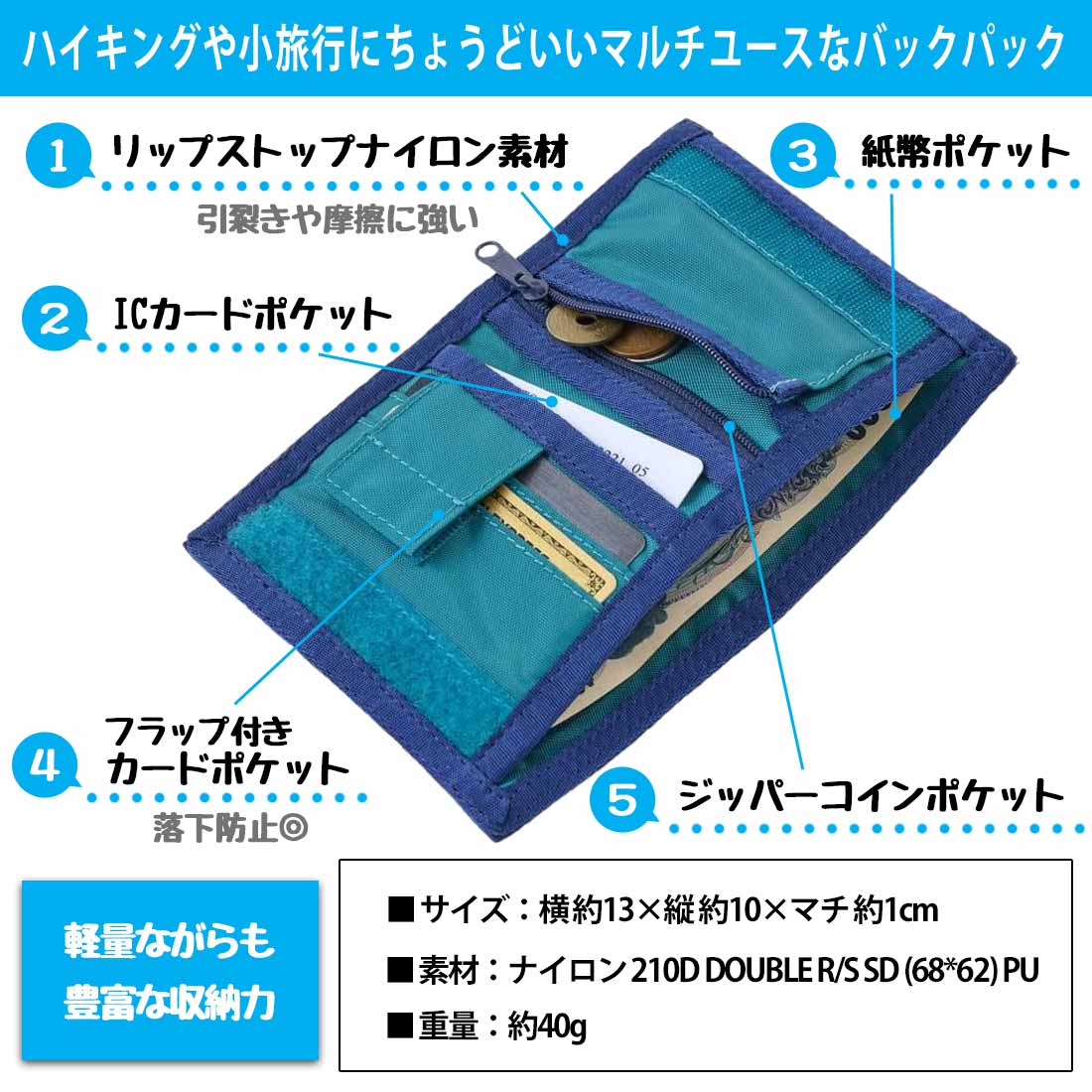 引裂きや摩擦に強いリップストップナイロン素材を使用した、二つ折りのウォレット。IDなどのカード類の収納に便利なカードポケット、フラップ式カードポケットを備え、もちろん紙幣と小銭も収納でき、軽量ながらも豊富な収納力を備えた使いやすさが魅力です。