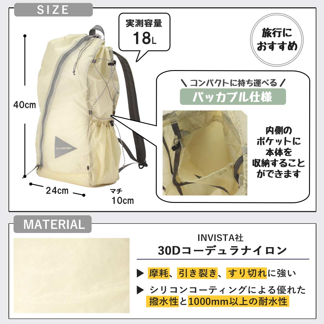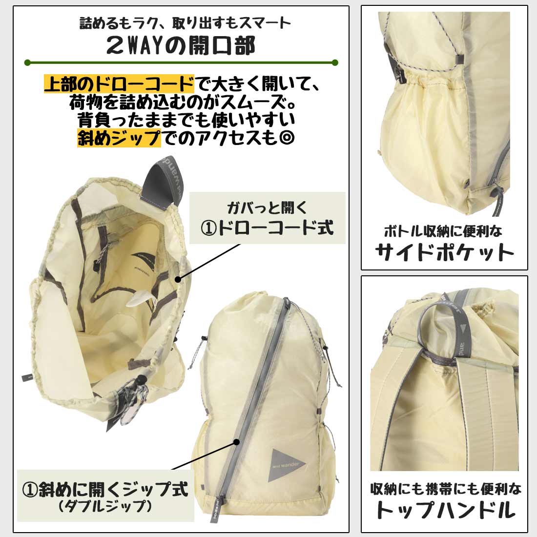 ▼ andwander アンドワンダー バックパック バッグ ジャケット ボトム ショルダー 傘 帽子 アウトドア ハイキング キャンプ ▼