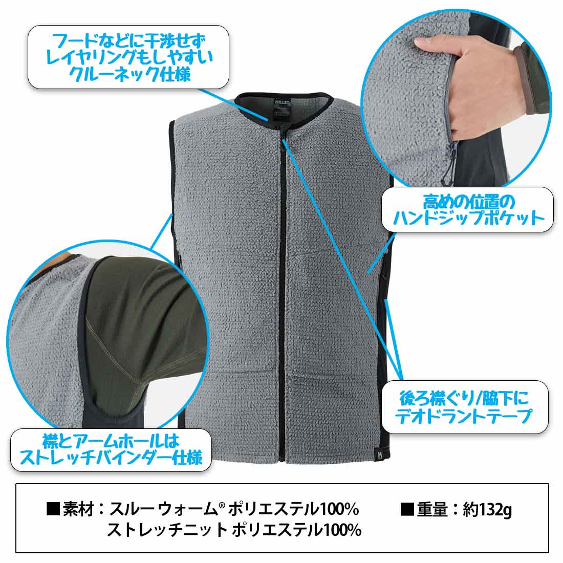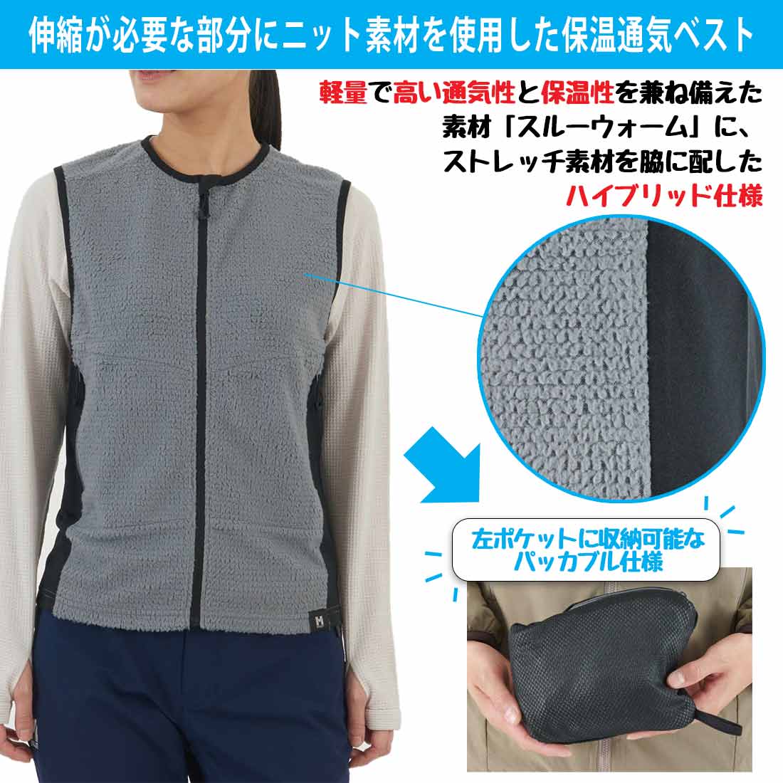 軽量コンパクトでありながら高い保温性と抜群の通気性を提供するアクティブインシュレーションベスト。メイン生地には独自のメッシュ構造で編立した薄手の吸汗性起毛素材スルー