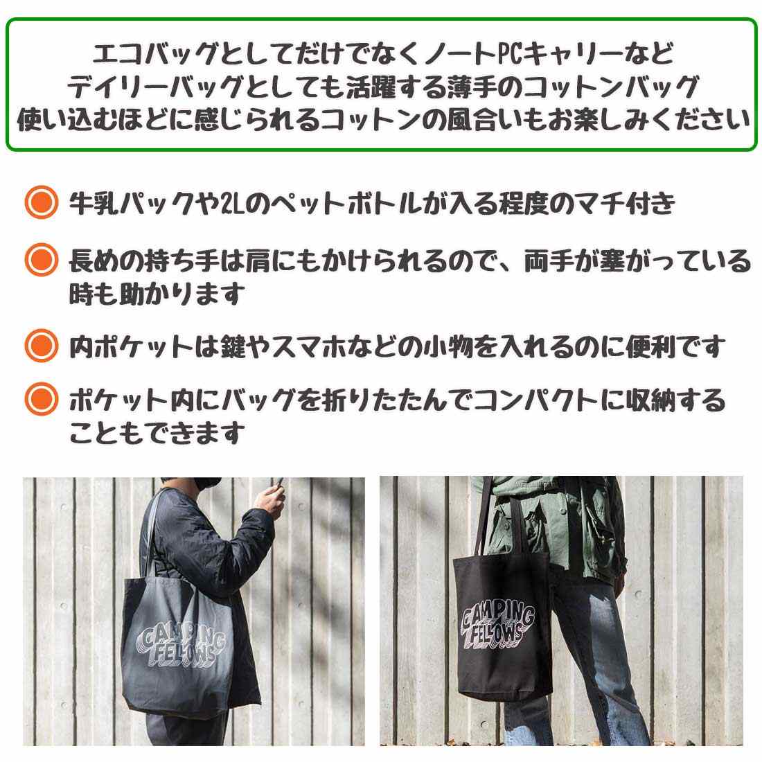 『CAMPING FELLOWS(キャンプ仲間たち)』のロゴをプリントしたマルチパーパスエコバッグ。