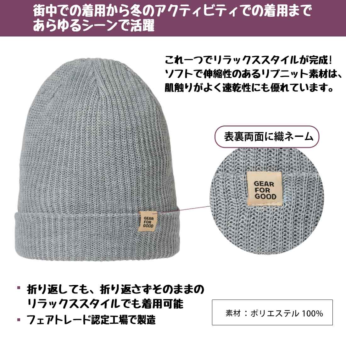 折り返してもそのままのリラックススタイルでも着用可能なソフトビーニー